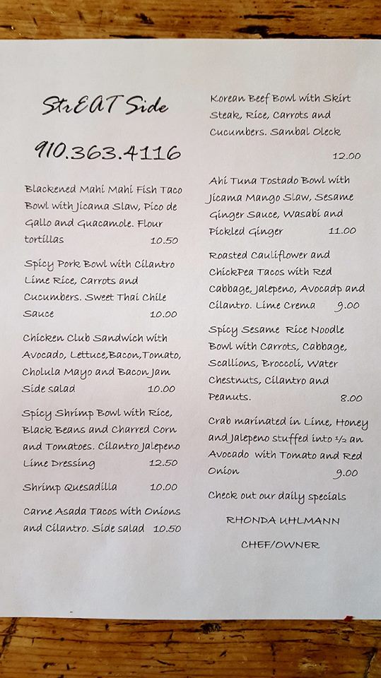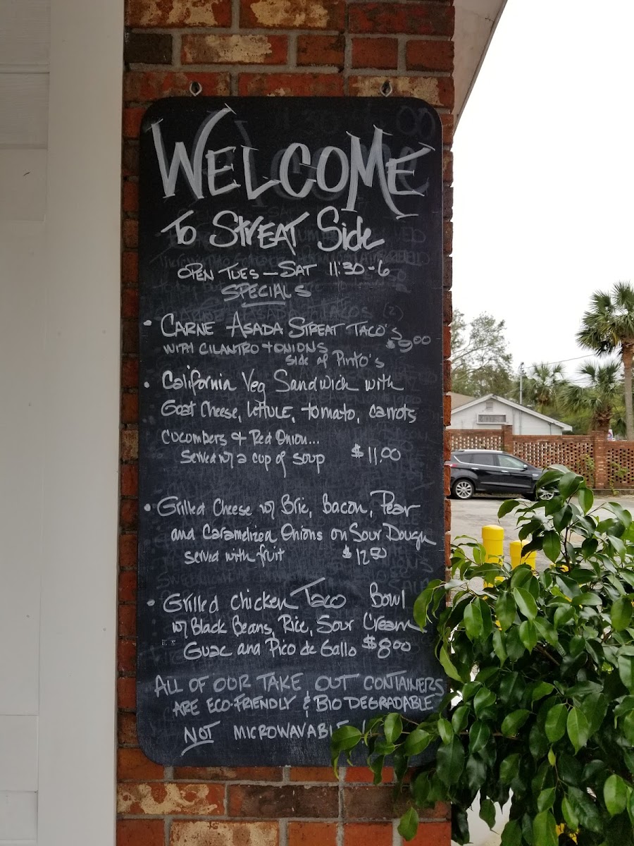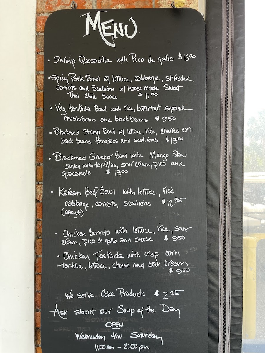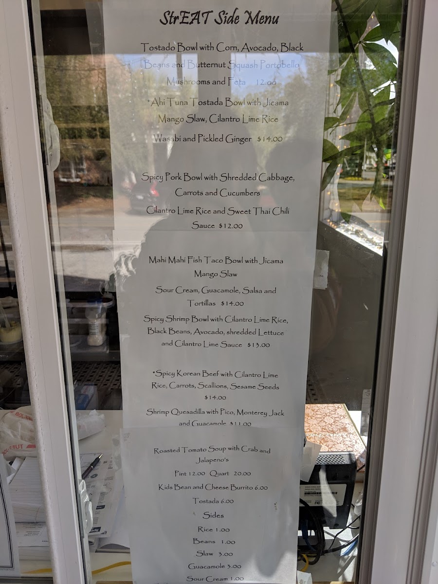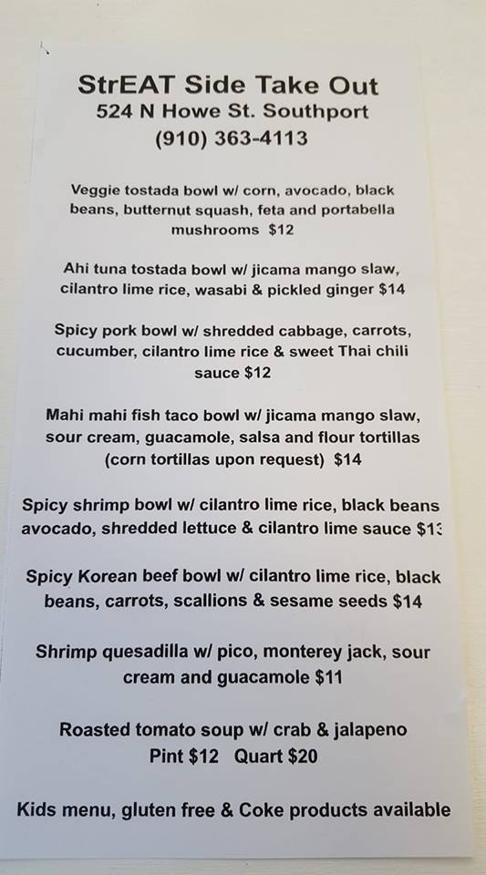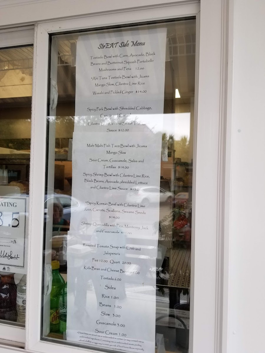 The menu at Streat Side Take Out offers a variety of fresh and flavorful dishes perfect for any craving. For those who enjoy a hearty bowl, options like the Tostado Bowl, Ahi Tuna Tostada Bowl, and Spicy Pork Bowl with shredded cabbage, carrots, and cucumbers are standout choices. If you're looking for something with a bit of heat, the Spicy Shrimp Bowl featuring cilantro lime rice, black beans, avocado, and shredded lettuce, topped with a cilantro lime sauce, is a must-try. For a tropical twist, the Mahi Mahi Fish Taco Bowl with jicama mango slaw delivers a refreshing bite. There’s also a variety of sides available, including rice, beans, slaw, and additions like guacamole and sour cream to complement your meal. For those preferring something different, the menu features tasty options like the Shrimp Quesadilla with pico de gallo, a Chicken Burrito, and a Blackened Mahi Mahi Fish Taco Bowl with jicama slaw, pico de gallo, and guacamole, served with flour tortillas. Each dish is packed with bold flavors and a satisfying combination of ingredients. Whether you're after a light, zesty bowl or a filling wrap, Streat Side Take Out offers a delicious, well-rounded menu that is sure to satisfy.